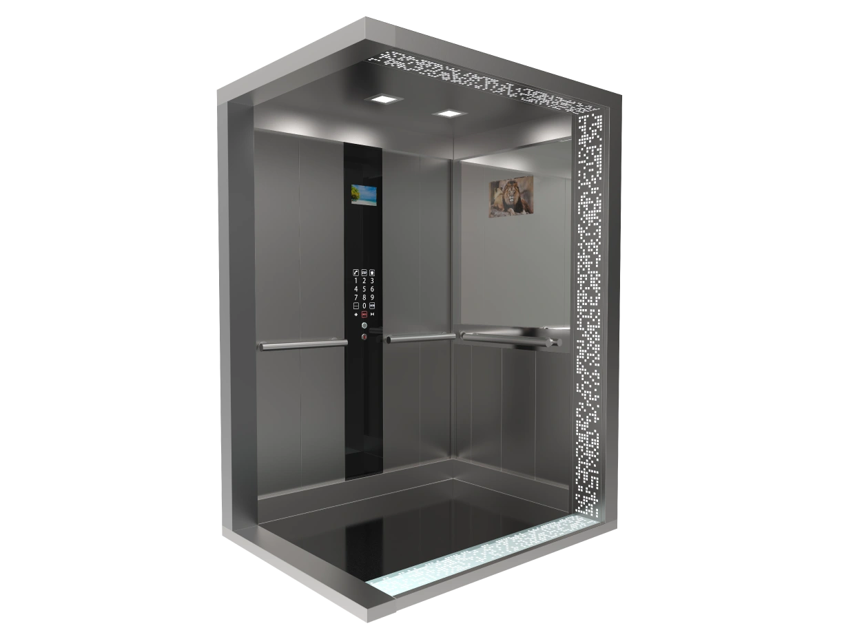 Gran sensación de amplitud, ya que es especialmente diseñada para elevadores con capacidad para 10 personas o más. Paneles en acero pulido de extremo a extremo y esquinero curvos. Medio paño de espejo al fondo.